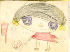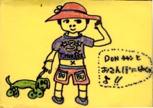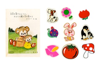 1年目(3歳)が黄色い表紙、2年目(4歳)が白い表紙のようです。ノートの表紙は親や兄弟が描いてくれています。2年目は本人だったりもするようです。教室について、先生の所でごあいさつすると、ノートにその日の日付のハンコをおしてもらい、シールを貼らせてもらえました。これが楽しみ。先生はいろんなモチーフのシールを探して来てくれて、何種類かあるときは、早く到着した子から好きな柄を選ばせてもらえるのでした。